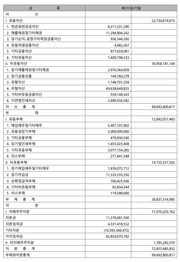 ※감사의견: 위 대차대조표를 포함한 제17기 연결재무제표는
