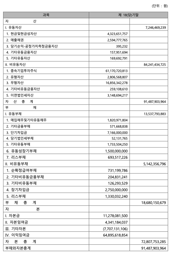 ※감사의견: 위 대차대조표를 포함한 제18기 재무제표는