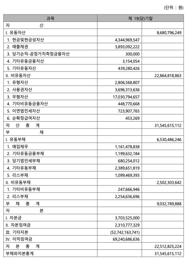※감사의견: 위 대차대조표를 포함한 제19기 재무제표는