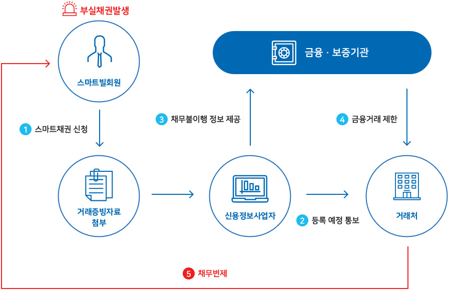 리스크관리 거래처 리스크관리 조기경보 기업정보 채무불이행등록 휴폐업조회 서비스 정의 서비스 특징 효과적인 거래처 부실채권 확보! 채무불이행등록 스마트채권에서 간편하게 온라인 채무불이행등록이 가능합니다.상거래 상 물품이나 용역을 공급하였으나 대금(미수금, 부실채권)을 회수하지 못한 경우, 신용정보사업자에 등록하고, 채무기업의 금융 거래를 제약하여 자진 변제하도록 유도하는 서비스입니다.